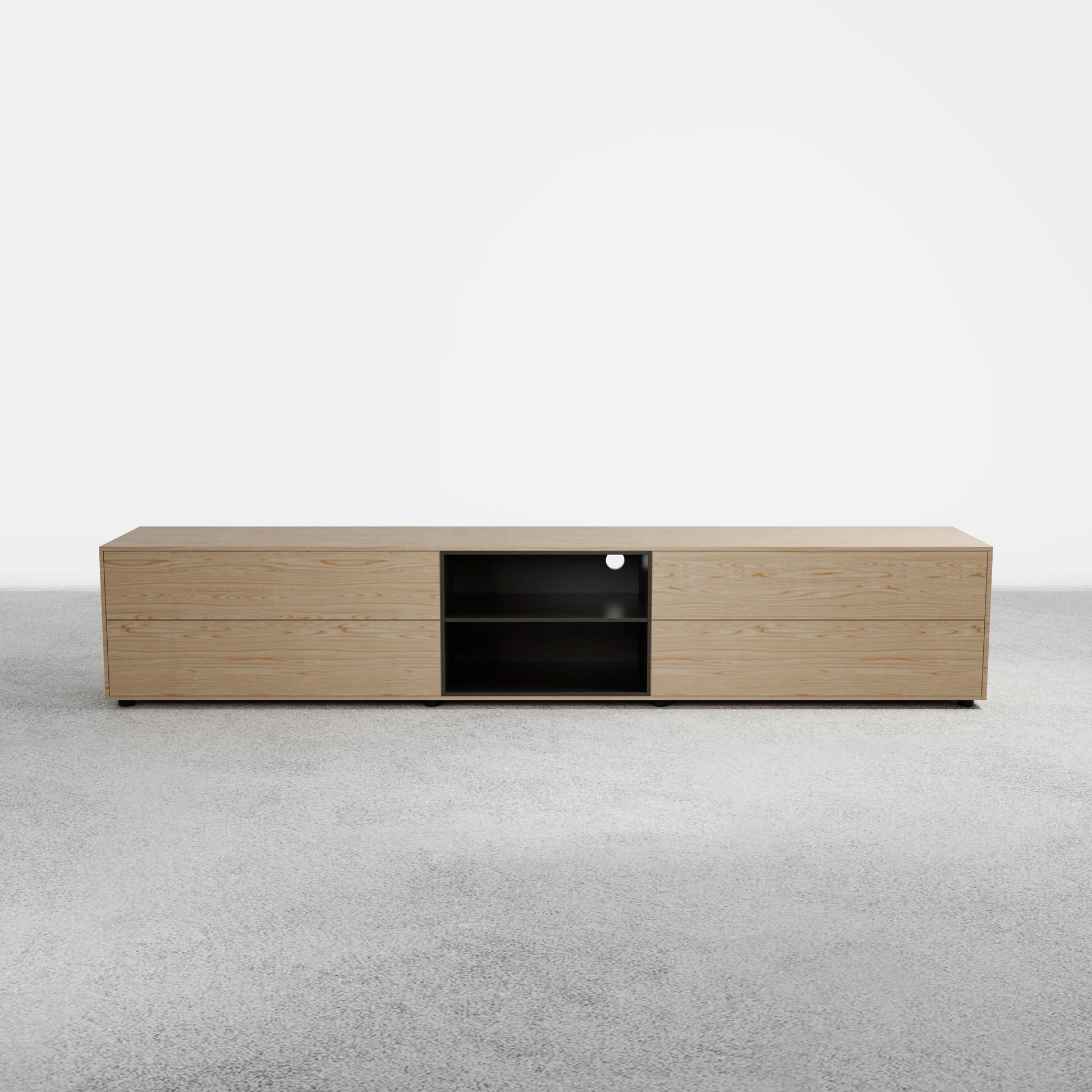 Le meuble TV en plaqué de vrai bois allie luxe et accessibilité.
