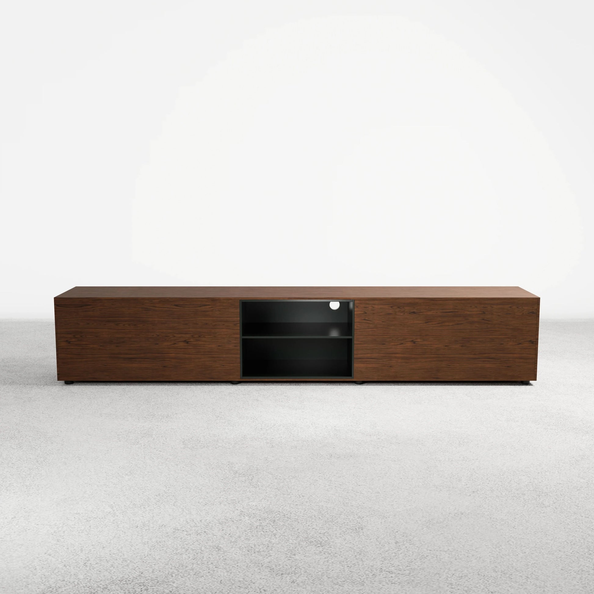Le meuble TV en plaqué de vrai bois allie luxe et accessibilité.
